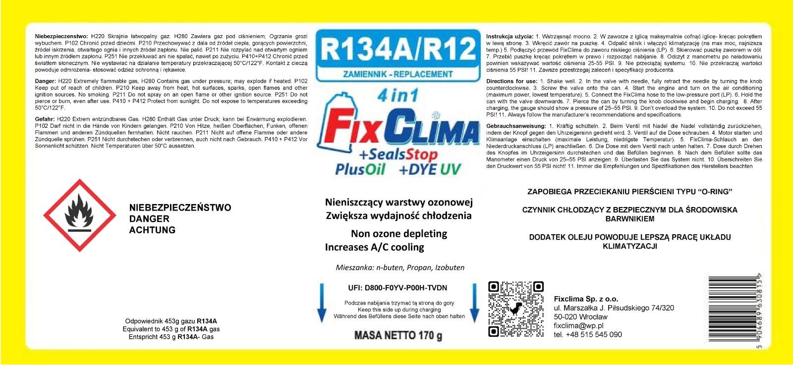 The R134A 4in1 FIX gas car air conditioning kit is a replacement for R134a refrigerant that allows you to quickly and safely refill your car's air conditioning system – for vehicles from 1995–2016. Designed with high quality and efficiency in mind, it is suitable for both routine and emergency service.